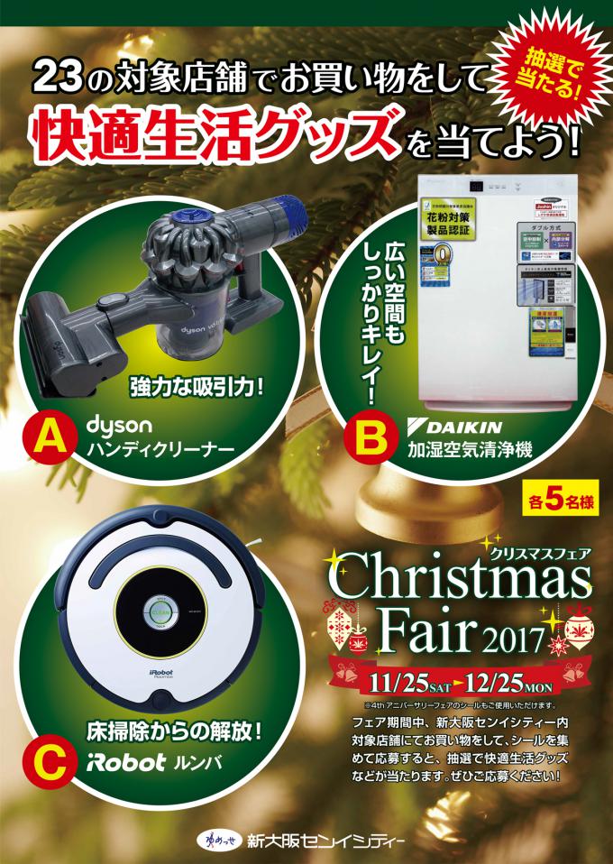 「クリスマスフェア 2017」は終了致しました。 多くの方のご来館誠にありがとうございました。 ご応募いただい方の中から抽選で生活快適グッズ、センイシティーご利用券を総勢115名様にプレゼント。抽選結果は景品の発送をもってかえさせていただきます。