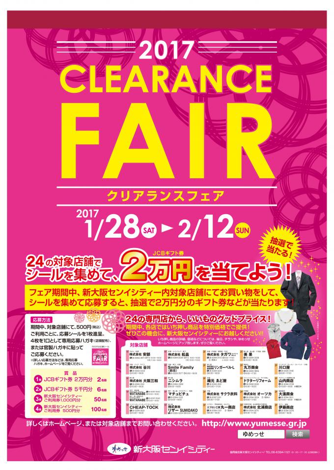 1月28日(土)~2月12日(日)の期間「クリアランスフェア」を開催中です。 2,000円お買い上げごと(500円ごとに補助シール[4枚で1口ご応募いただけます])にJCBギフトカードをはじめ、センイシティーご利用券が抽選で総勢158名様に当たる応募シールをお配りしております。 是非、この機会にお越し下さい。(^O^) ↓↓↓ クリアランスフェアのチラシがご覧いただけます ↓↓↓