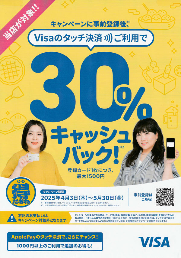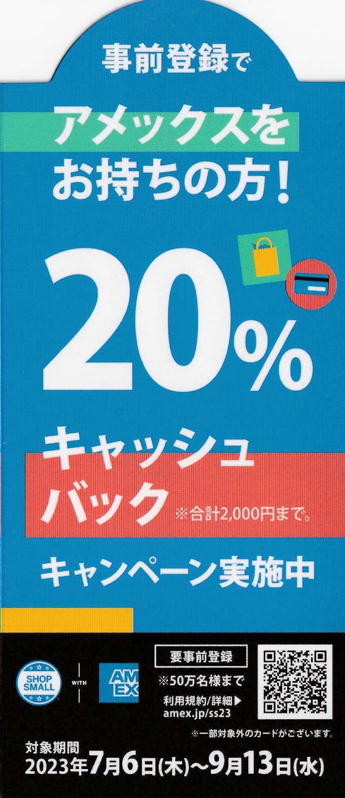 7/6木~9/13水の期間中、事前にキャンペーン登録済みのアメリカンエクスプレスの会員様が当店のお支払いで「アメックスカード」をご利用いただきますと「20%」(最大¥2000)のキャッシュバックを受けられます。(カード会員様のカードご利用代金明細書上で実行されます。)