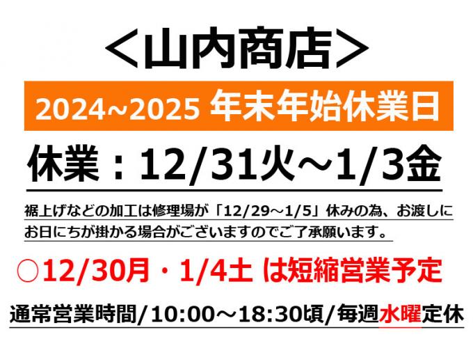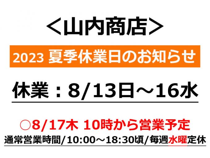 お知らせ:山内商店の年末年始休業は<12/30水~1/3日>予定ですが、営業時間など変更の場合もありますので、確定次第こちらのページに表記させていただきますのでご確認いただけますようお願いいたします。山内商店