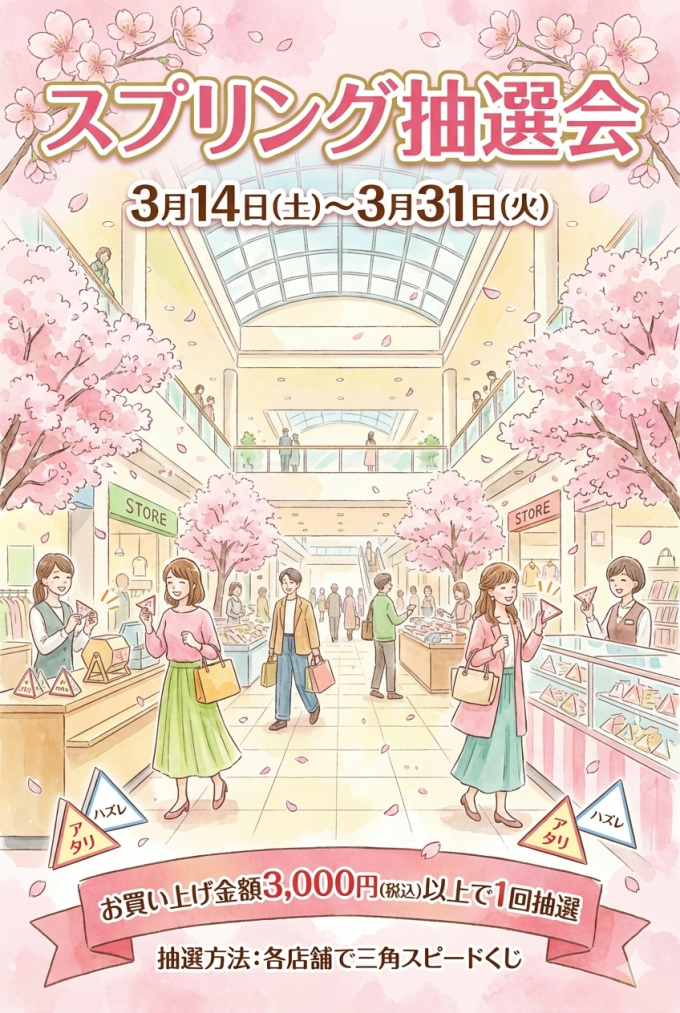 🌸スプリング抽選会🌸 いつもご利用ありがとうございます✨ 春のお買い物をもっと楽しくする「スプリング抽選会」が、スタートします! お買い上げ金額 3,000円(税込)で、その場で結果がわかる「三角スピードくじ」にチャレンジできます🎯 📅 開催期間 3月14日(土)~3月31日(火) 📍 抽選方法 各店舗のレジにてスピードくじを引いていただけます! 春の新作アイテムや新生活の準備に合わせて、ぜひ運試しを楽しんでくださいね🛍️ 皆様のご来店を心よりお待ちしております!